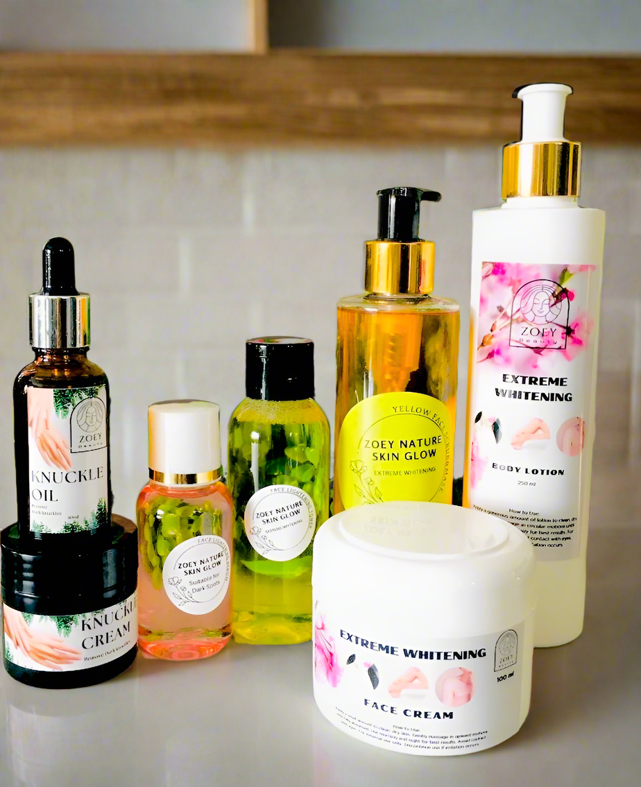 Achieve your dream skin tone with the Extreme Whitening Kit, which includes a powerful combination of a body lotion, face cream, toner, and face serum. Follow this simple routine for best results: