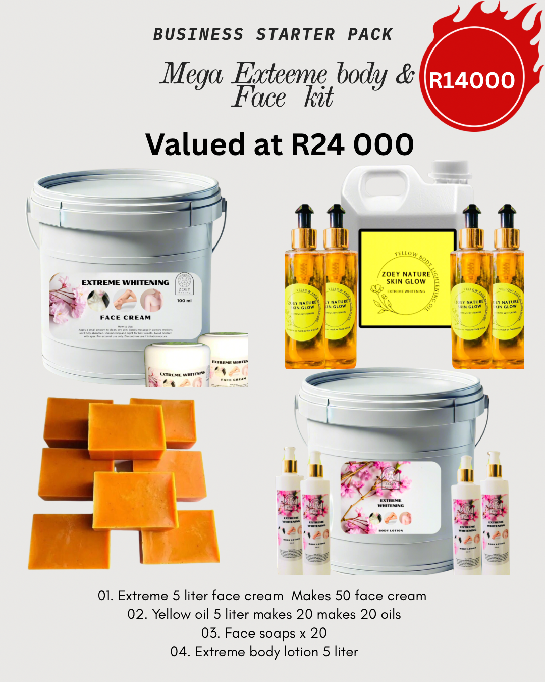 2. 5 liter extreme whitening body lotion makes 20 200mls of body lotion you can sell for R900 each which will make R18 000